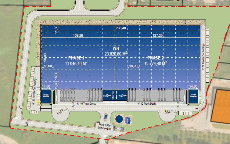 La fase 1 prevede la costruzione di un immobile logistico dotato di 10 baie di carico, 1 accesso a raso, altezza sottotrave di 12 metri, impianto sprinkler NFPA, luci LED e certificazione LEED Gold.