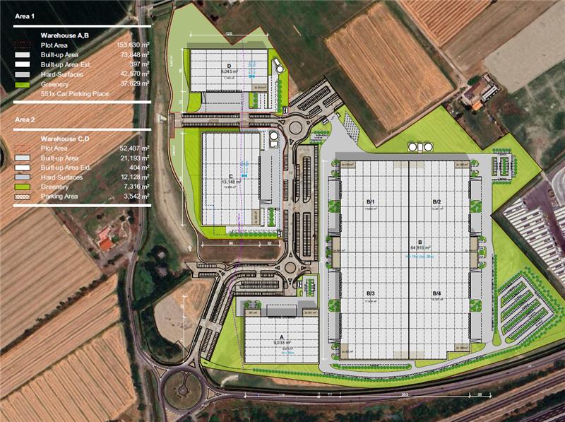 Il complesso prevede la realizzazione, in una prima fase, di due immobili logistici rispettivamente da 9.000 mq e 65.000 mq (frazionabili).