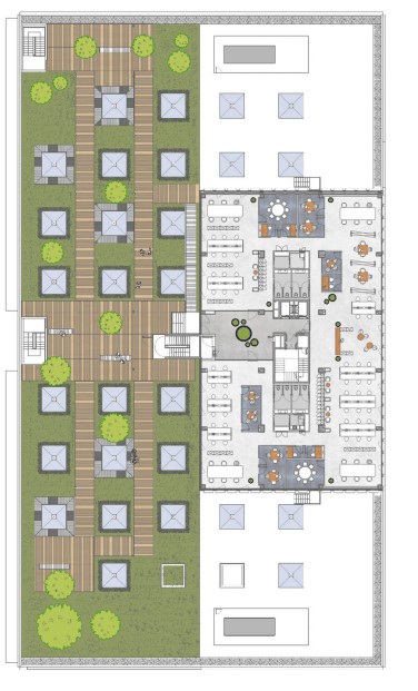 Frame Building si erge per 7 piani fuori terra: ampiezza e luce sono tra gli elementi distintivi di tutti i suoi ambienti, pensati per accogliere spazi di lavoro flessibili, aree modulabili e ampie terrazze luminose.