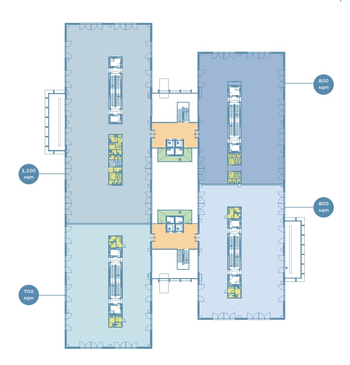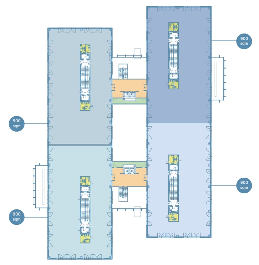 Gli uffici sono caratterizzati da soluzioni tecniche all'avanguardia, con pavimenti flottanti e controsoffitti ispezionabili che garantiscono la massima flessibilità degli spazi. L'altezza minima di 3 metri assicura ambienti luminosi e ariosi. I sistemi di climatizzazione avanzati, l'illuminazione ad alta efficienza e i moderni sistemi di controllo accessi completano l'offerta di un ambiente lavorativo di prima classe.